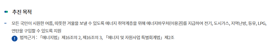 모든 국민이 시원한 여름, 따뜻한 겨울을 보낼수 있도록 에너지 취약계층을 위해 에너지바우처 (이용권)을 지급하여
