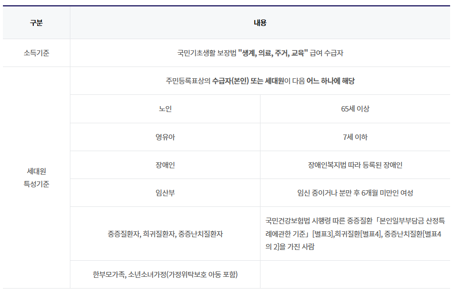 지원제외 대상으로는 세대원 모두가 보장시설 수급자인 경우 안된다고 합니다.