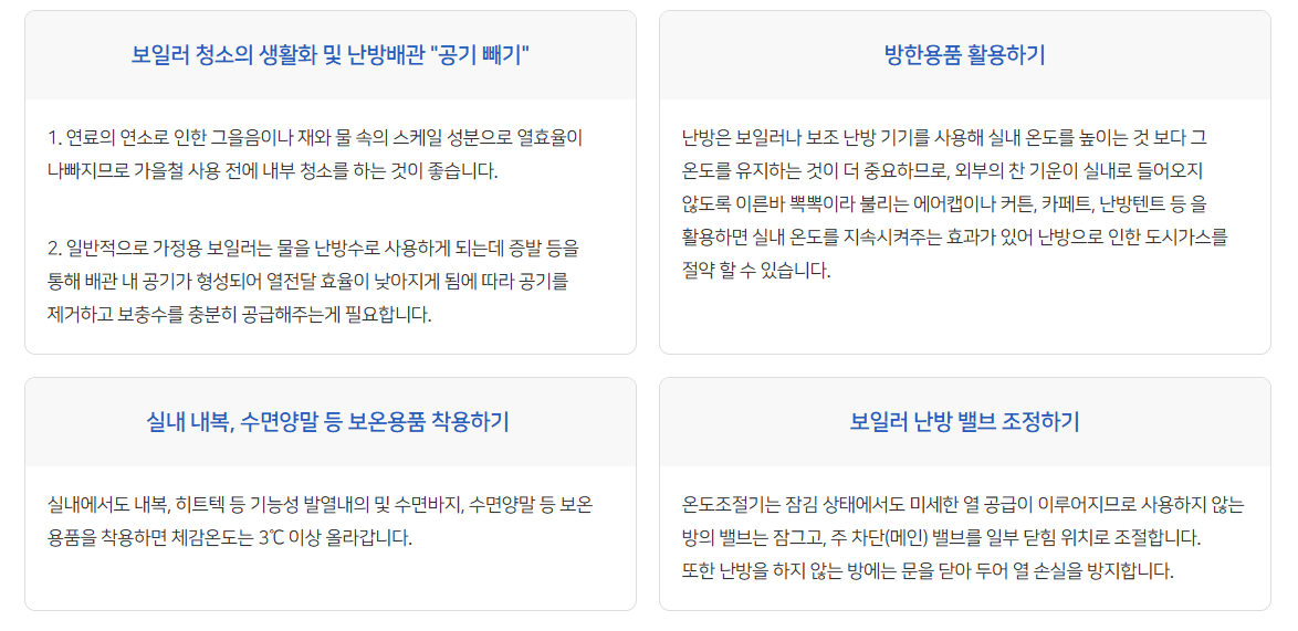 난방은 보일러나 보조 난방 기기를 사용해 실내 온도를 높이는 것 보다 그 온도를 유지하는 것이 더 중요하므로, 외부의 찬 기운이 실내로 들어오지 않도록 이른바 뽁뽁이라 불리는 에어캡이나 커튼, 카페트, 난방텐트 등 을 활용하면 실내 온도를 지속시켜주는 효과가 있어 난방으로 인한 도시가스를 절약 할 수 있습니다.