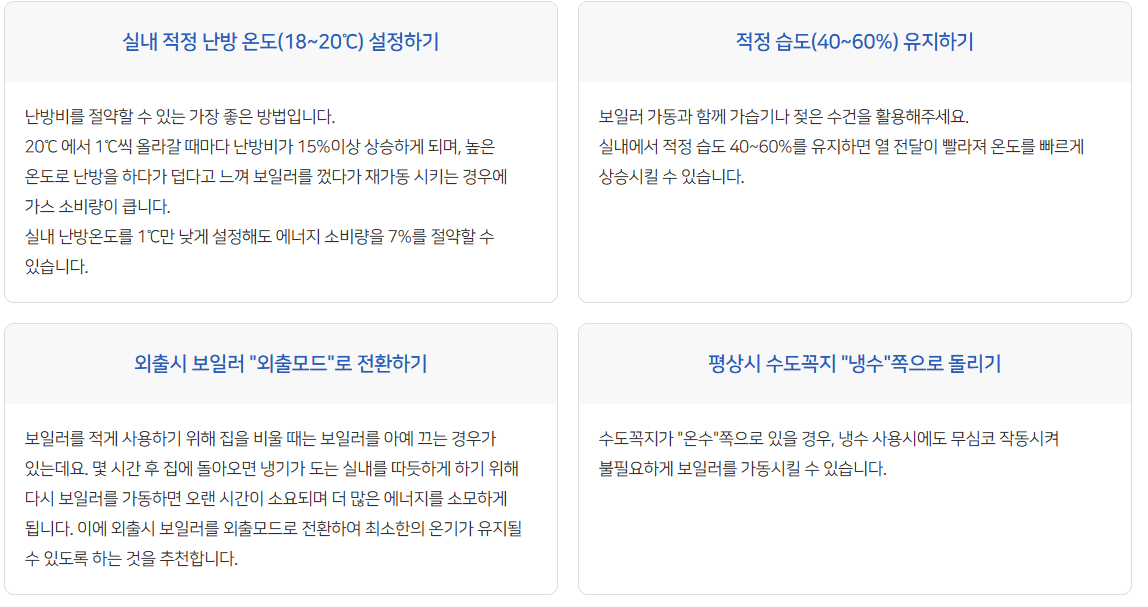 보일러를 적게 사용하기 위해 집을 비울 때는 보일러를 아예 끄는 경우가 있는데요. 몇 시간 후 집에 돌아오면 냉기가 도는 실내를 따듯하게 하기 위해 다시 보일러를 가동하면 오랜 시간이 소요되며 더 많은 에너지를 소모하게 됩니다. 이에 외출시 보일러를 외출모드로 전환하여 최소한의 온기가 유지될 수 있도록 하는 것을 추천합니다.