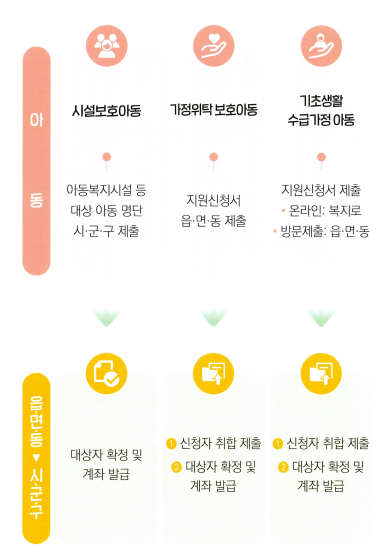 시설보호아동: 아동복지시설 등 대상 아동명단 시.군,구 제출 → 대상자 확정 및 계좌발급