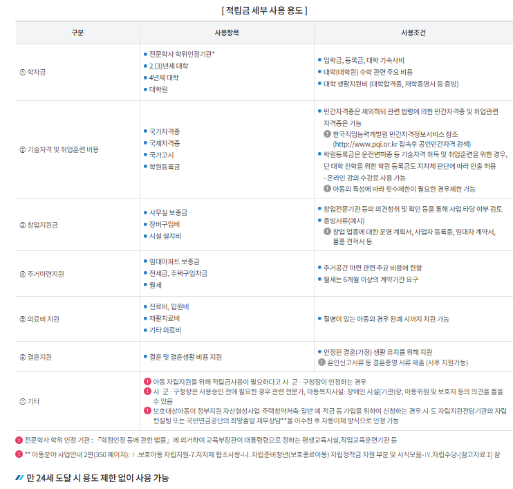 - 만 24세 이후: 사용하지 않은 적립금은 자립 목적과 무관하게 인출 가능.