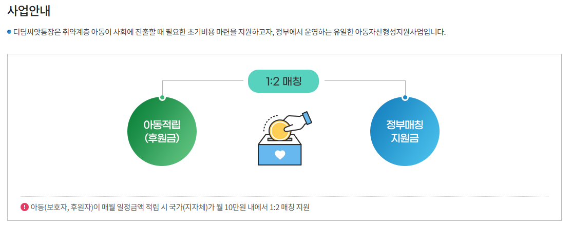 - 1:2 매칭 지원: 아동, 보호자, 또는 후원자가 매월 일정 금액을 적립하면 정부가 최대 10만 원 한도로 1:2 비율로 매칭 지원합니다.