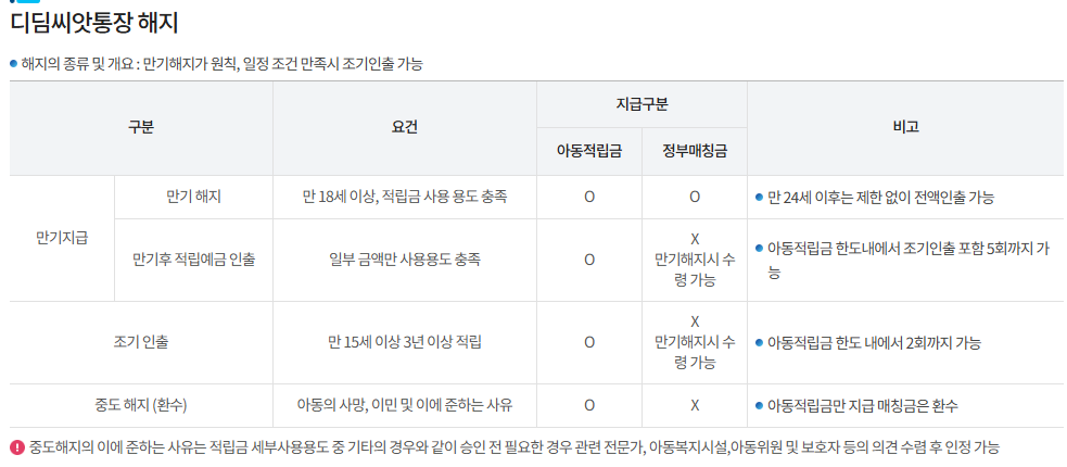 - 만기 해지: 원칙적으로 만 18세 이후에 적립금을 사용 가능.