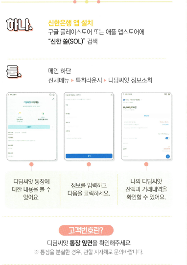 - 신한은행 앱 설치 후 전체 메뉴 > 특화 라운지 > 디딤씨앗 정보조회를 통해 신청 가능.