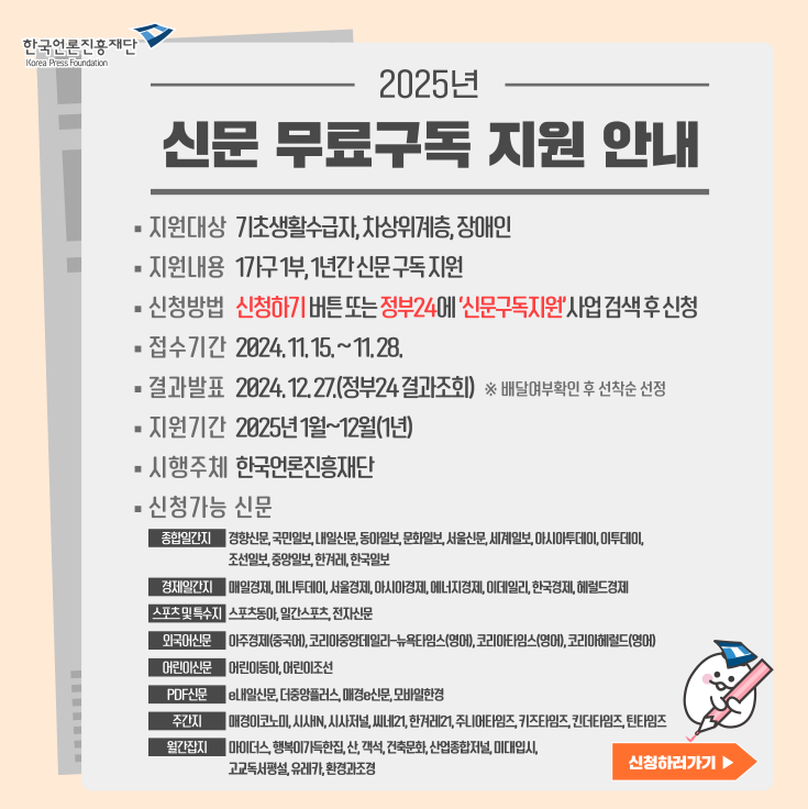 신청 수요 및 배달지역 사정에 따라 2순위 신문으로 선정되거나 지원이 불가할 수 있습니다.