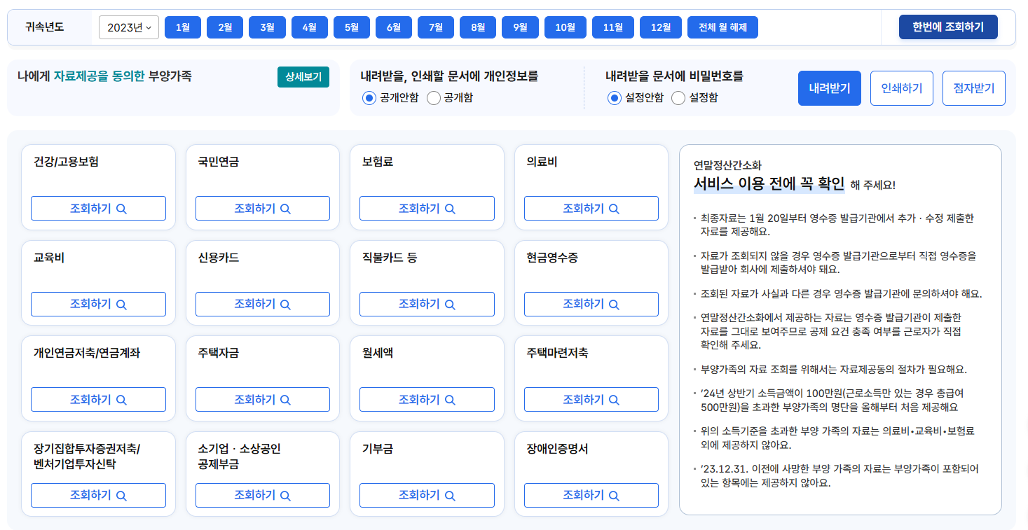 한번에 조회하기 후 내용확인후 내려받기 해주시면 됩니다.
