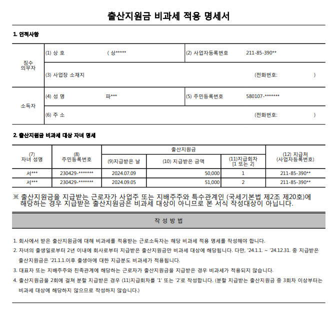 회사에서 받은 출산지원금에 대해 비과세를 적용받는 근로소득자는 해당비과세 적용 명세를 작성해야 합니다.