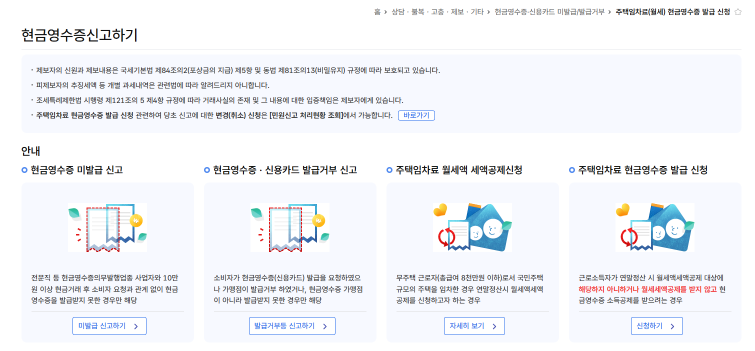 2. 홈> 상담,불복,고충,제보,기타 > 현금영수증 신용카드 미발급/발급거부 >주택임차료(월세)현금영수증발급신청