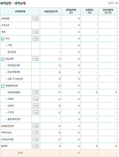 - 소득공제: 보험료, 주택자금, 교육비 등.