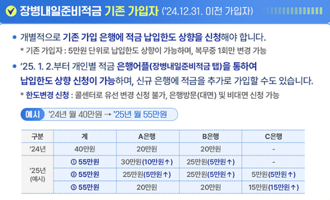 기존가입자: 5만원 단위로 납입한도 상향이 가능하며, 복무중 1회만 변경 가능