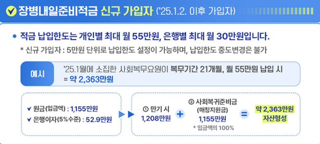 예시: 25년 1월에 소집한 사회복무요원이 복무기간 21개월, 월 55만원 납입시 = 약 2,363만원