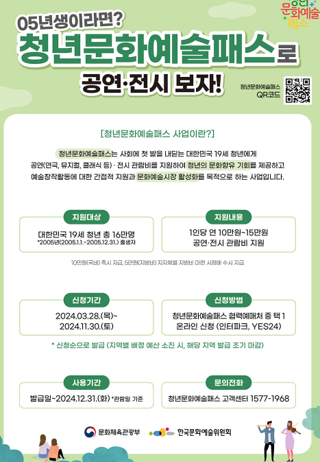 청소년문화예술패스는 대한민국 만 19세를 위한 연극, 뮤지컬, 클래식 콘서트, 전시회 등 공연 관람료를 지원하는 프로그램입니다. 이는 청년들의 예술과 문화 참여를 장려하는 동시에 지역 예술 시장을 지원하기 위한 정부 지원 이니셔티브입니다.