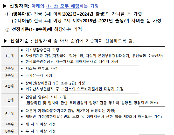 - 영유아용 카시트: 3세 이하(2022년~2024년 출생)의 자녀가 있는 가정