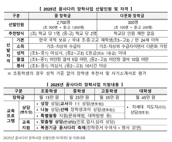 - 지원 대상: 학교장 추천을 받은 저소득층 학생