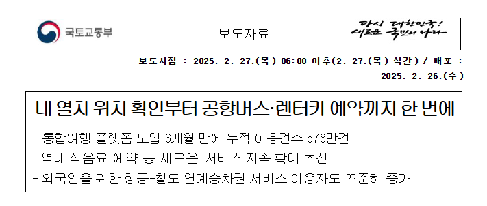 📌 국토교통부의 통합여행 플랫폼 도입 이후, 6개월 만에 578만 건의 누적 이용이 발생하면서 성공적인 교통 서비스 혁신으로 평가받고 있습니다.