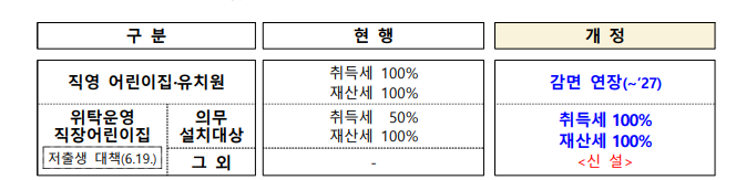 취득세, 재산세가 100% 감면되며 어린이집을 직접 경영하는 개인사업자에 대해서는 주민세(사업소분)을 면제한다.