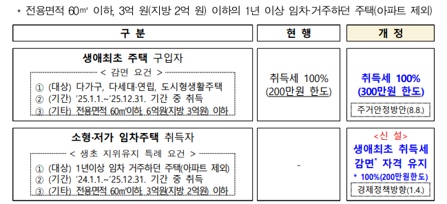 또한 다가구주택, 빌라 등 소형 저가주택에 전월세로 거주하다가 해당주택을 취득한 경우에는 추후 아파트 등 주택 구입시 생애최초 주택감면 자격을 계속 유지하도록 특례를 신설한다.