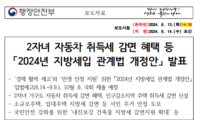 행정안전부에서 경제 활력제고와 민생안정지원을 위한 2024년 지방세입 관계법 개정안을 발표했습니다.