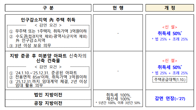 과밀억제권역 외 지역으로 이전하는 법인, 공장에 대한 취득세,재산세 감면도 3년간 연장한다.