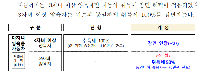 기존에는 3자녀 이상 양육자만 자동차 취득세 감면 혜택이 적용되었지만