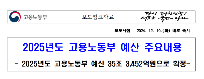 2024년 12월 10일 국회 본회의에서 2025년 예산이 결의되었고 2025년 예산은 일,가정,양립,노동약자보호,청년,장애인 등 대상별 일자리 지원 강화에 중점투자되었다고합니다. 이런 정보를 놓치지 않으셔야 합니다.