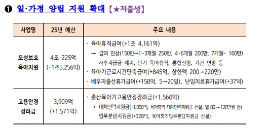 - 육아기 근로시간단축급여: 2,355억(+845억, 주10시간까지 통상임금 100% 상한 200→220만원)