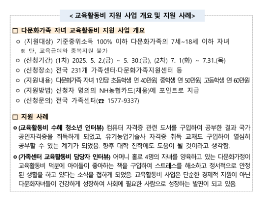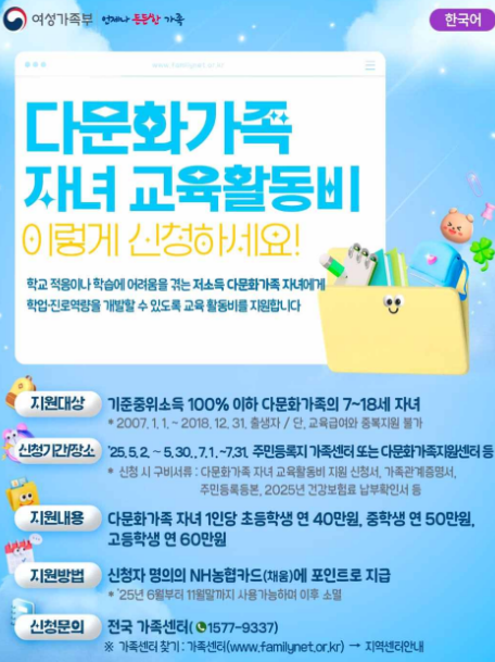 저소득 다문화가족의 7~18세 자녀에게 교육활동비를 지원하여 학력격차 완화 및 미래 인재로의 성장 지원 추진