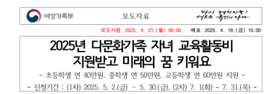 여성가족부는 다문화가족 자녀의 교육기회 확대, 학습격차 완화, 진로 역량강화를 위해 오는 5월부터 저소득 다문화가족 7세에서 18세 이하 자녀를 대상으로 교육활동비 신청을 받는다.