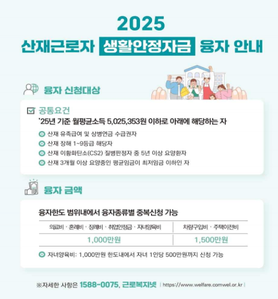 2025년 기준 월평균 소득 5,025,353원 이하로 아래 조건에 해당하는 산재 근로자: