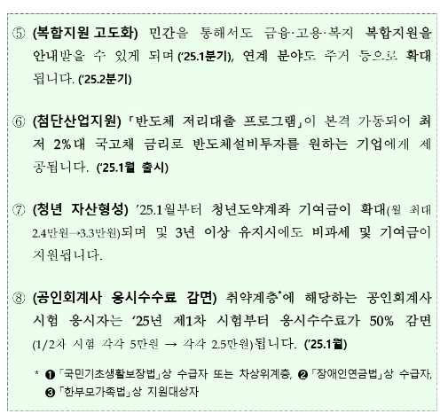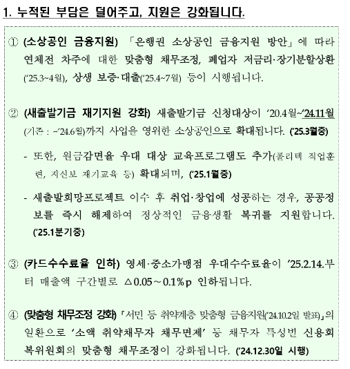 연체전 차주에 대한 맞춤형 채무조정, 폐업자 저금리,장기분할상환(25.3~25.4), 상생보증대출(25.4~25.7)등이 시행됩니다.