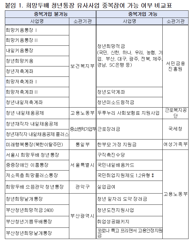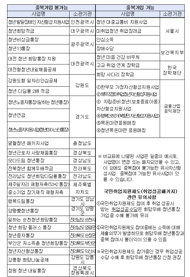 희망두배 청년통장은 서울시의 자산형성지원사업 중 하나로, 다른 유사 사업과 중복 참여가 제한될 수 있습니다.