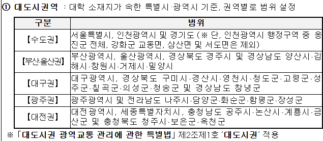 대학 소재지가 속한 시 기준, 인접한 시까지 동일 교통권 인정
