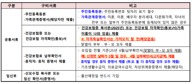 | 건강보험증 또는 자격확인서 | 맞벌이 부부는 모두 제출 | |