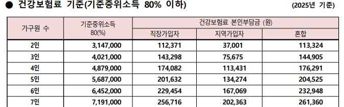 - 기준 중위소득 80% 이하 (2025년 4월 건강보험료 고지 금액 기준)