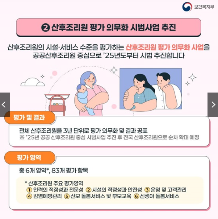산후조리원 평가 의무화 사업을 공공산후조리원 중심으로 25년부터 시범추진합니다.