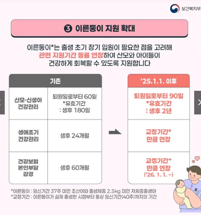 이른둥이는 출생 초기 장기입원이 필요한 점을 고려해 관련 지원기간 등을 연장하여