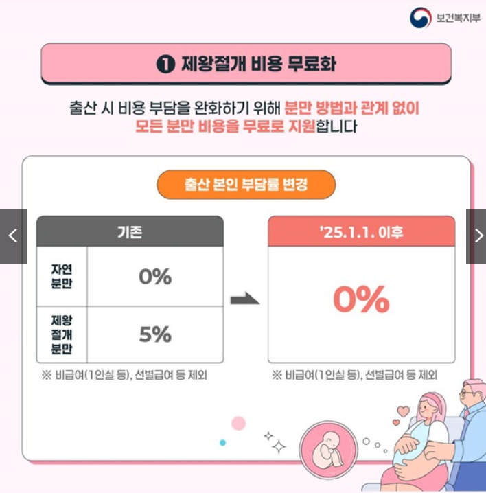 출산시 비용 부담을 완화하기 위해 분만 방법과 관계없이 모든 분만 비용을 무료로 지원합니다.