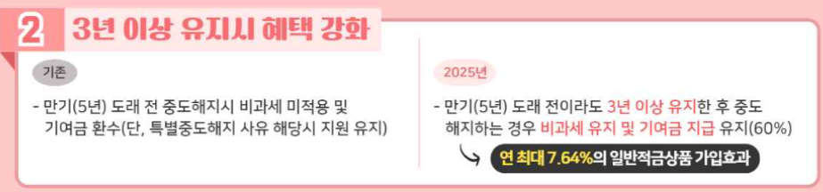 (변경) 만기 5년 도래전이라도 3년이상 유지한 후 중도해지하는 경우 비과세 유지 및 기여금 지급 유지(60%)