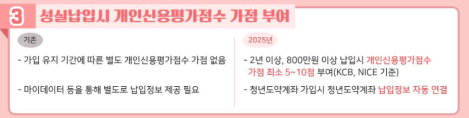 2년 이상 가입을 유지하고 800만원 이상 납입할 경우 개인 신용평가 점수가 5~10점 이상 자동적으로 부여된다.