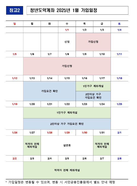 25년 1월 청년도약계좌 신청기간은 1월 2일 부터 10일(영업일로만 운영)로 취급은행 모바일앱에서 간편하게 가입신청이 가능하며, 기존에 가입을 신청하였으나 계좌를 개설하지 못했던 청년들도 동기간에 재 신청이 가능하다.